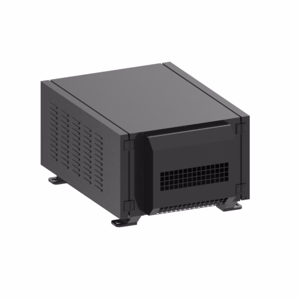 A robust air-cooled thermal management enclosure specifically engineered for the Panasonic REQ12K laser projector, providing reliable climate control and environmental protection for permanent outdoor installations.